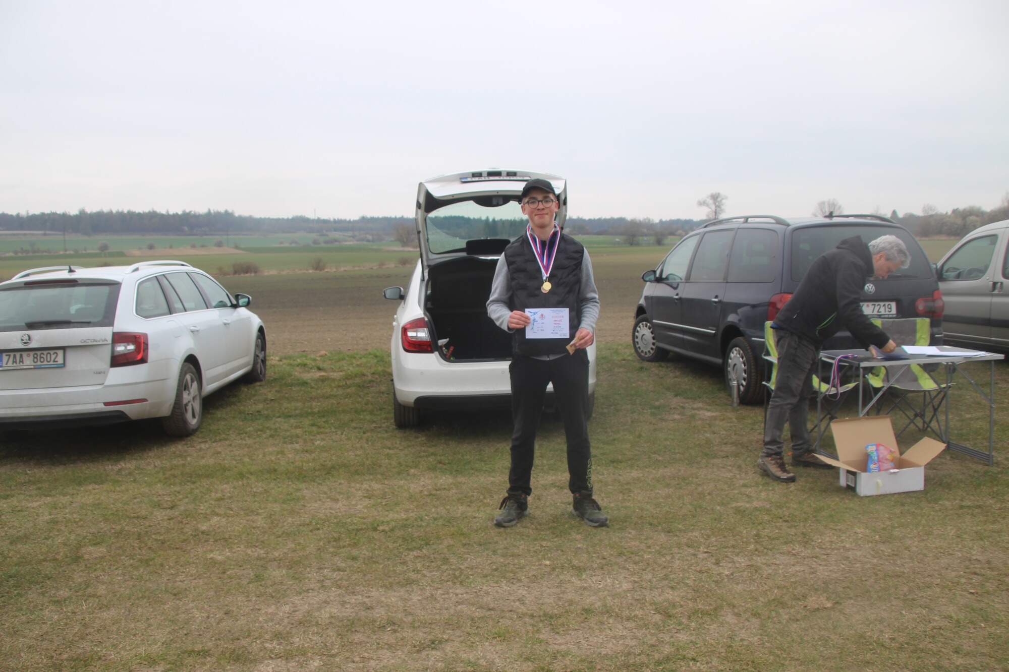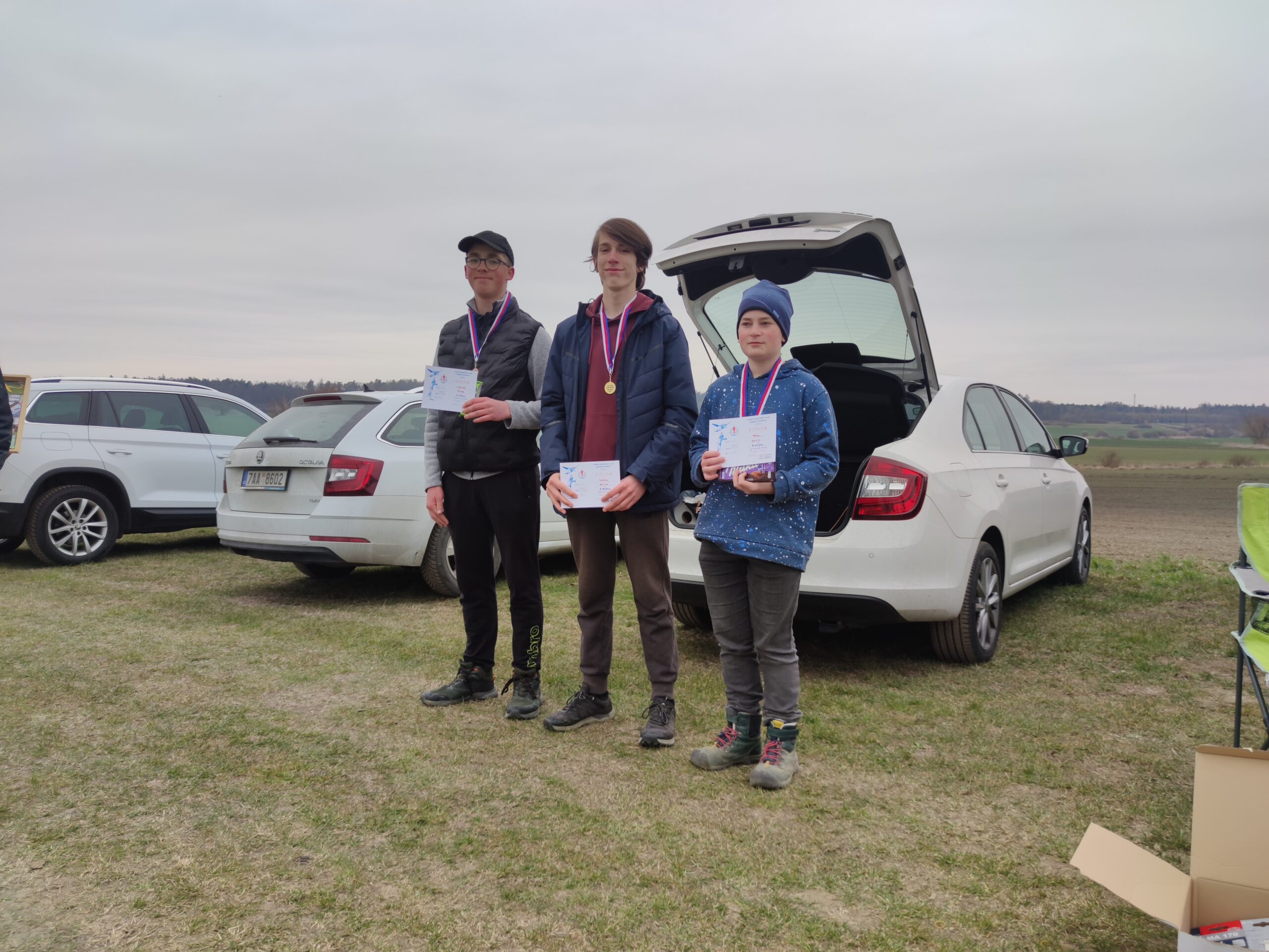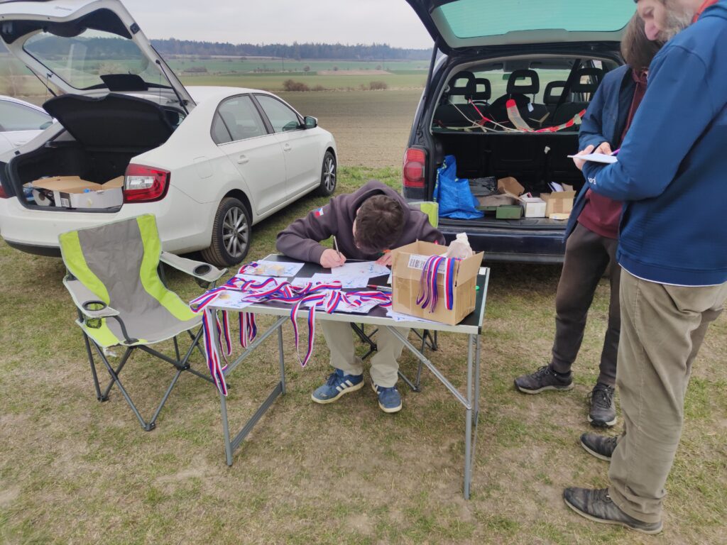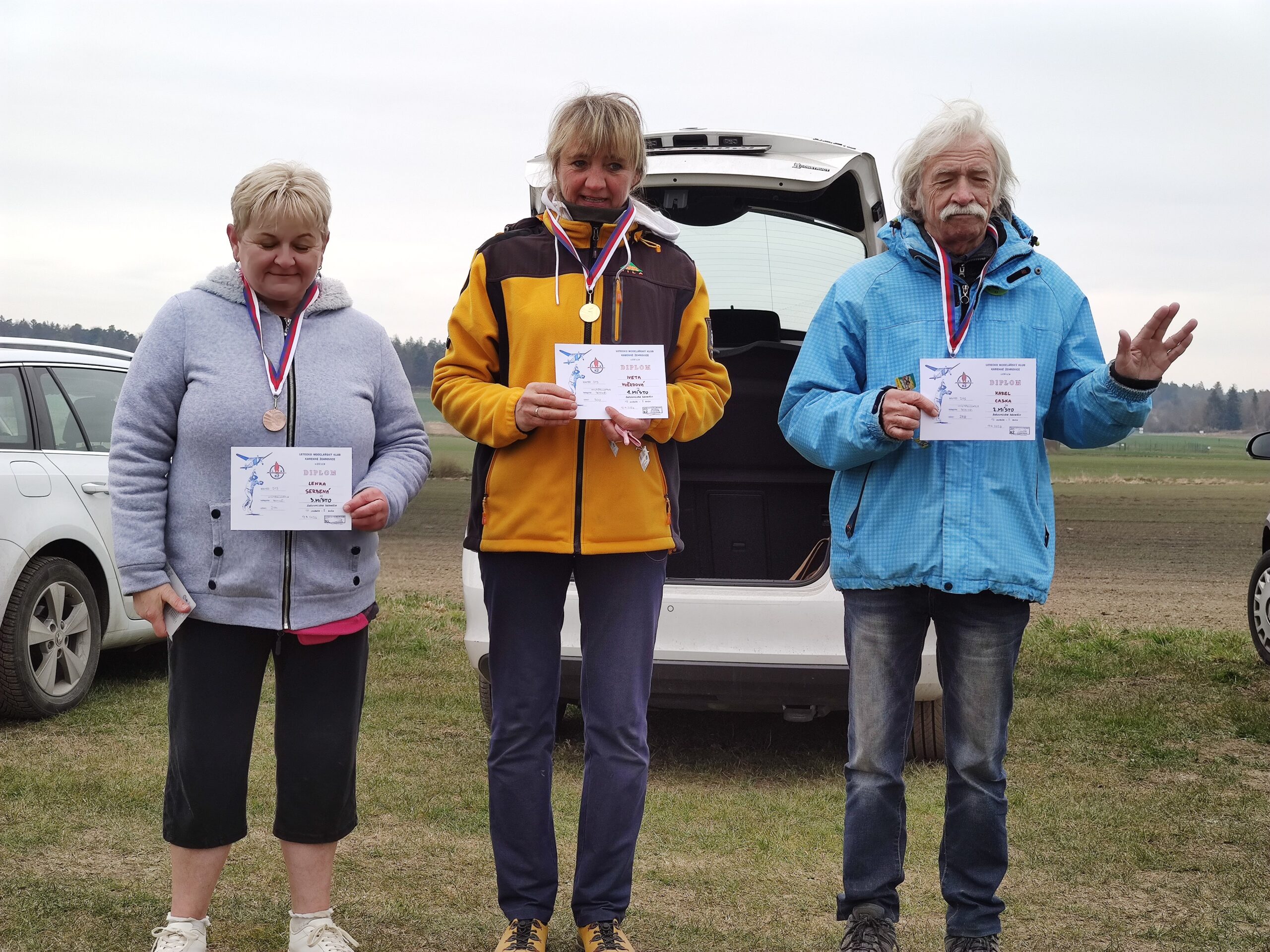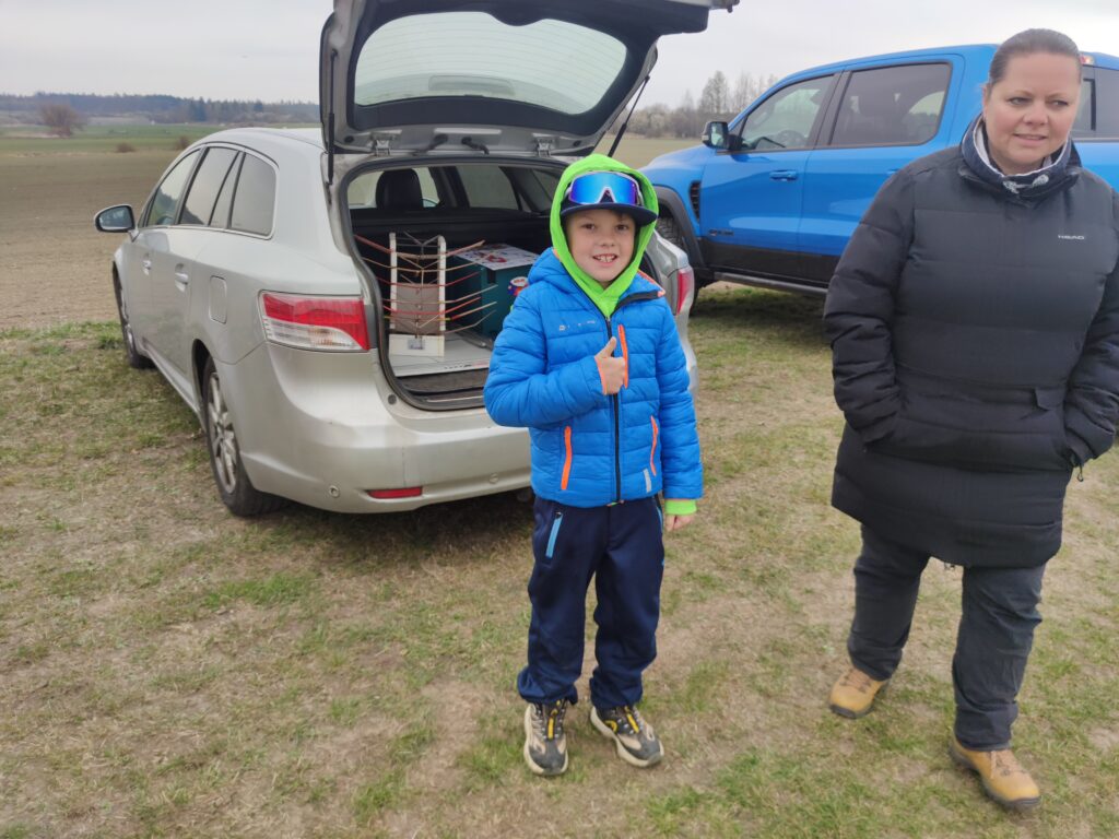 Od Kladna se přihnala hnědá kombíková Fabie s Mílou Modrem, Michalem Hládkem a Honzou Vrbou. Pak Jirka Hvězda se svým náklaďákem s celou rodinou. Minule jsem ze srandy zkritizoval Karla Casku, že jezdí pozdě. Tentokrát ale přijel se Zdeňkem Vrbou včas. Je to vzorňák. Jirka Šífi s Lenkou Serbenou přijeli plně vyzbrojeni létajícími aparáty. S nimi ve druhém autě přijeli Vaňkovi s dvěma dcerami. Z Blatné dojeli Loulovi a přivezli s sebou jednu kamarádku, která si již postavila tři vystřelovadla. Nesmím zapomenout ani na Jardu Charváta, který na naše soutěže jezdí již pravidelně. A Tomáš Beneš z Varnsdorfu, který je vlastně domácí a doufám, že bude na naše soutěže jezdit stabilně. Na koho jsem ve výčtu zapomněl, se najde ve výsledkové listině.