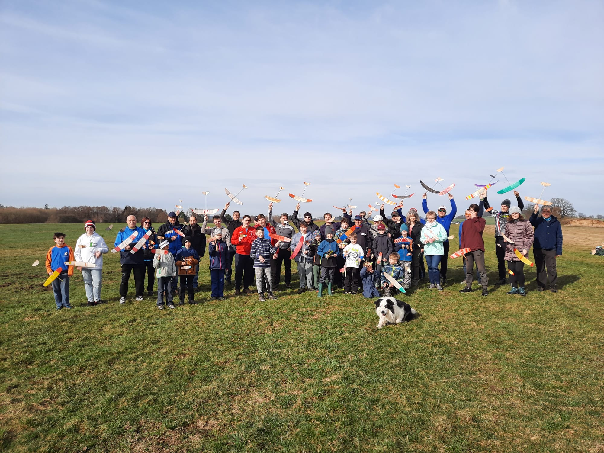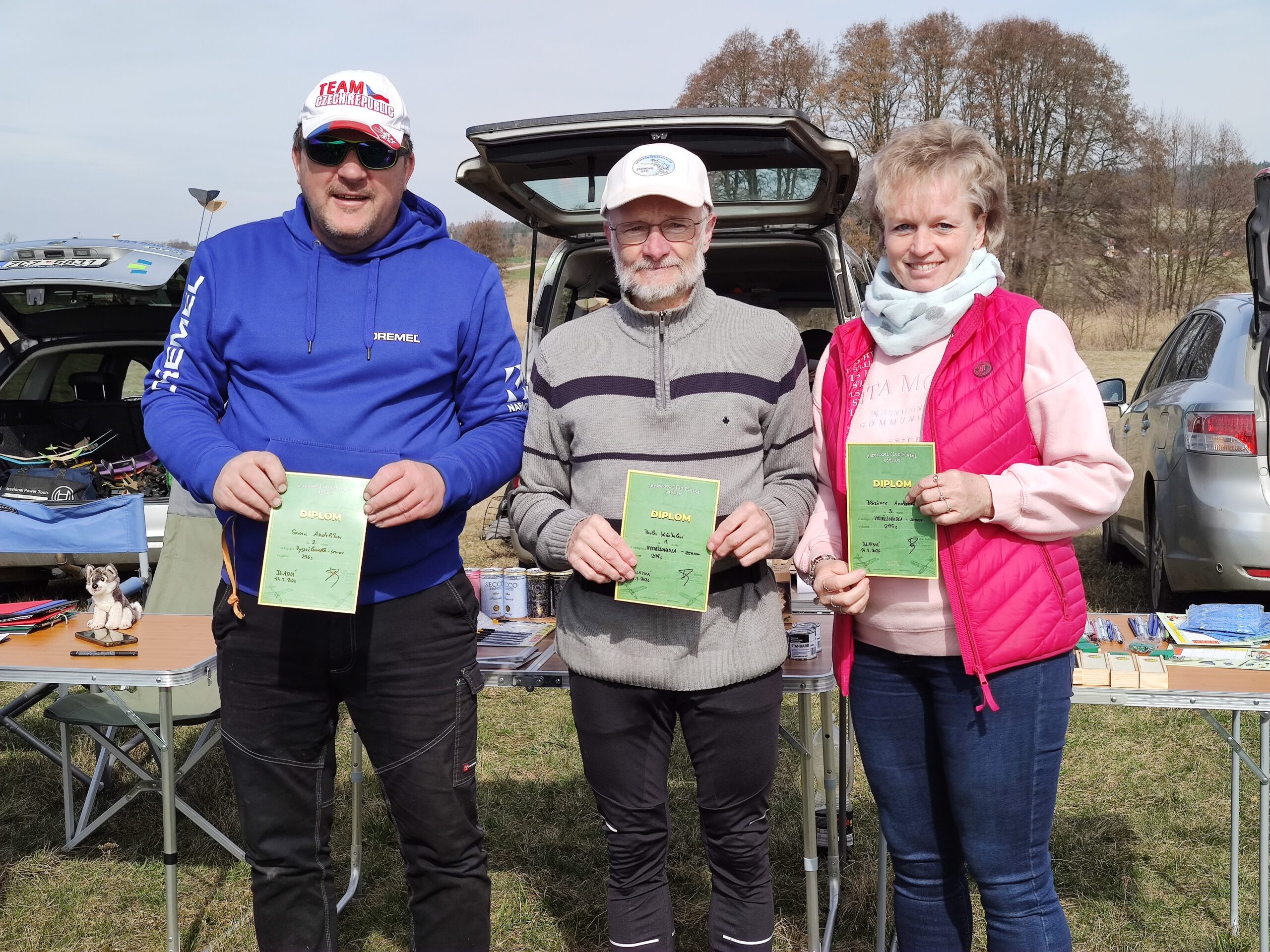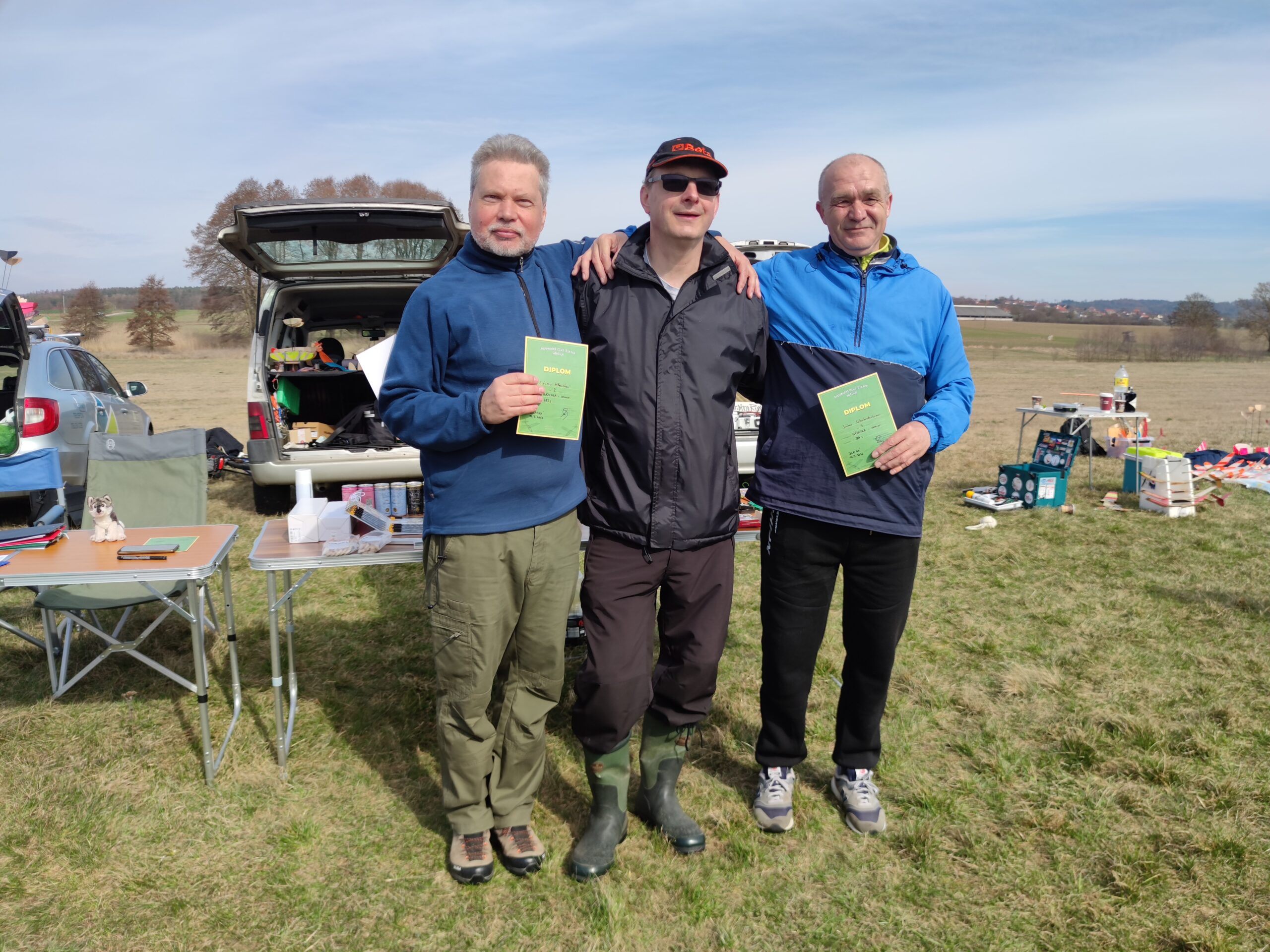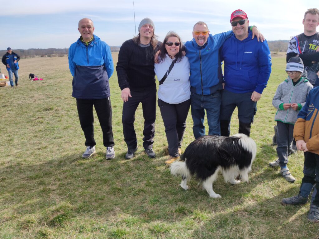 Na louce jsme byli první, asi po třech minutách se objevil Petr Loula se Zdeňkou a pak již se to začalo sjíždět ze všech světových stran. Opět v Blatné se vytvořilo zázemí s občerstvením, na stoly se nahrnuly buchty a koláče, které jsme ujídali. Vypadalo to na krásné počasí a první lety slibovaly dobré výkony. Optimisticky jsme se společně vyfotili, tedy nejprve hromadně a pak i jako KŽ tým. Ale přidali jsme tam Šífiho.
