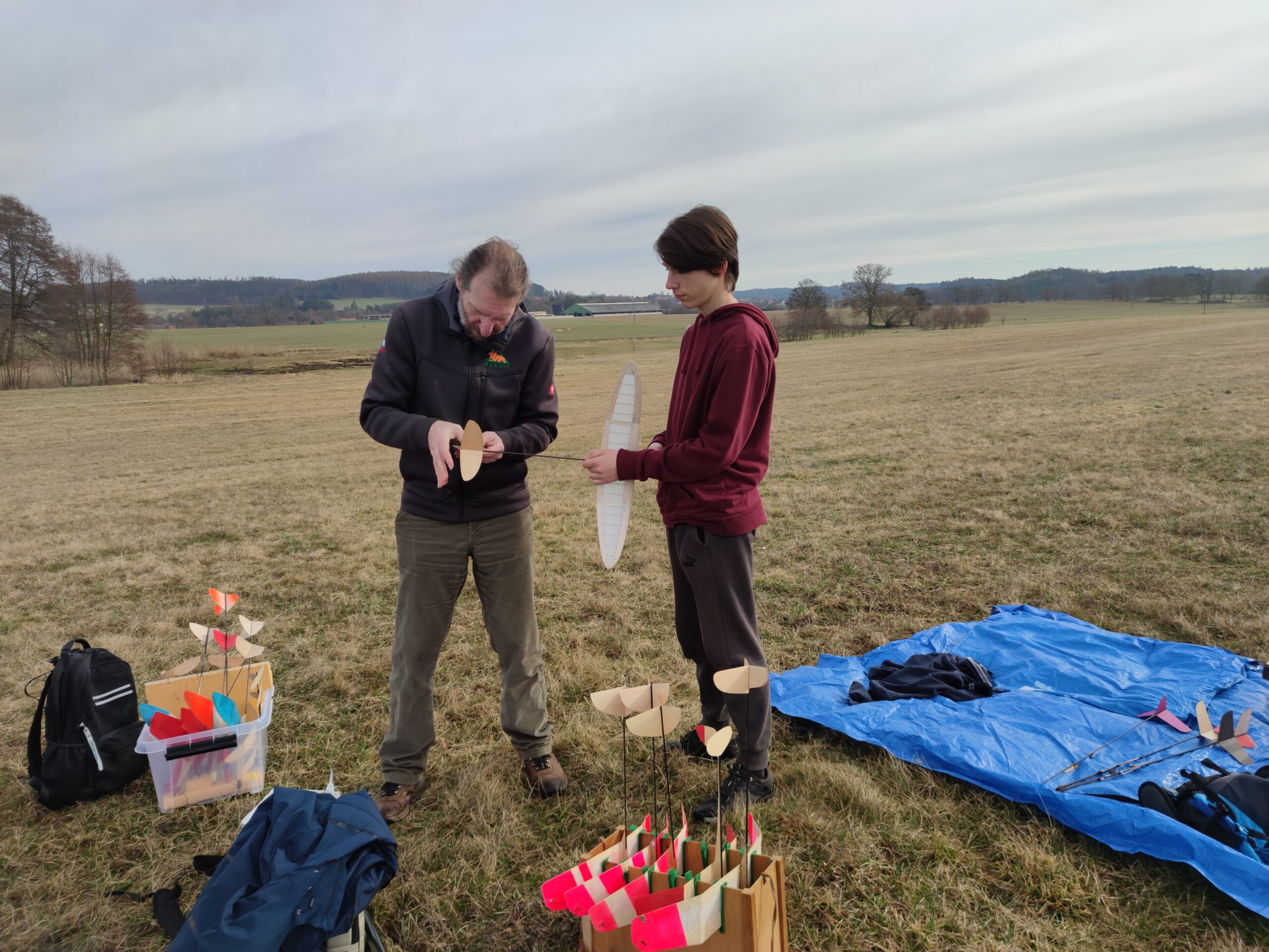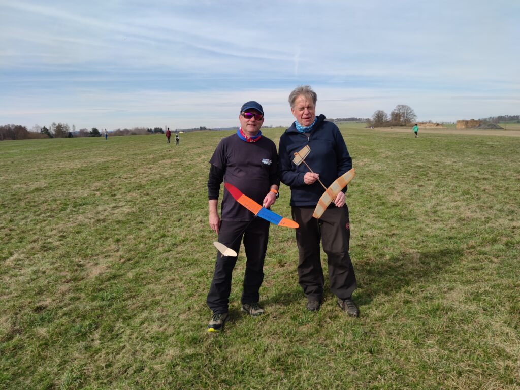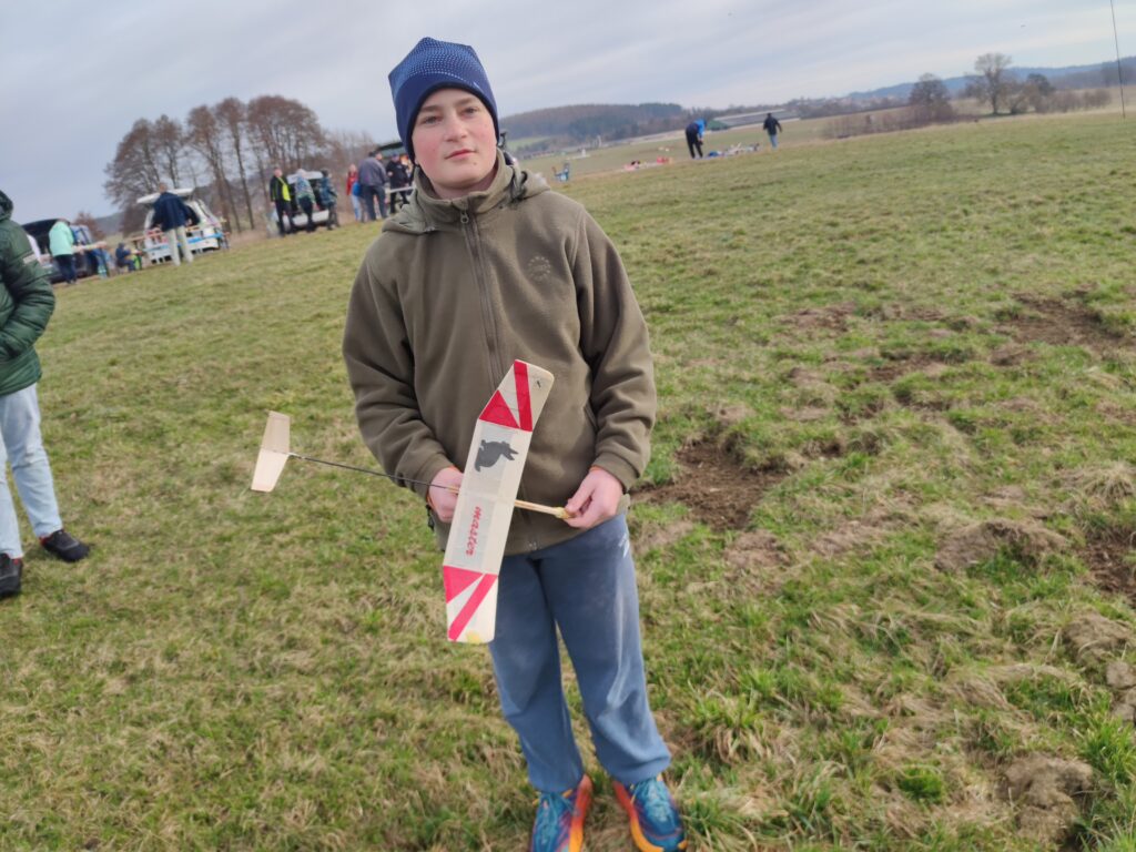 Max Vydra poprvé házel za ucho. Model ale potřeboval nejprve seřídit. To se mi sice podařilo, ale opět se za chvíli přenastavilo jinak. Musel jsme upravit pravý negativ tak, aby se již nevracel. Zalepil jsme jej. Pak to bylo mnohem lepší. Chtělo by to ale již nová kormidla, model už něco utrpěl a balsa je popraskaná. Až to s Kamilem opraví, bude to mnohem lepší.