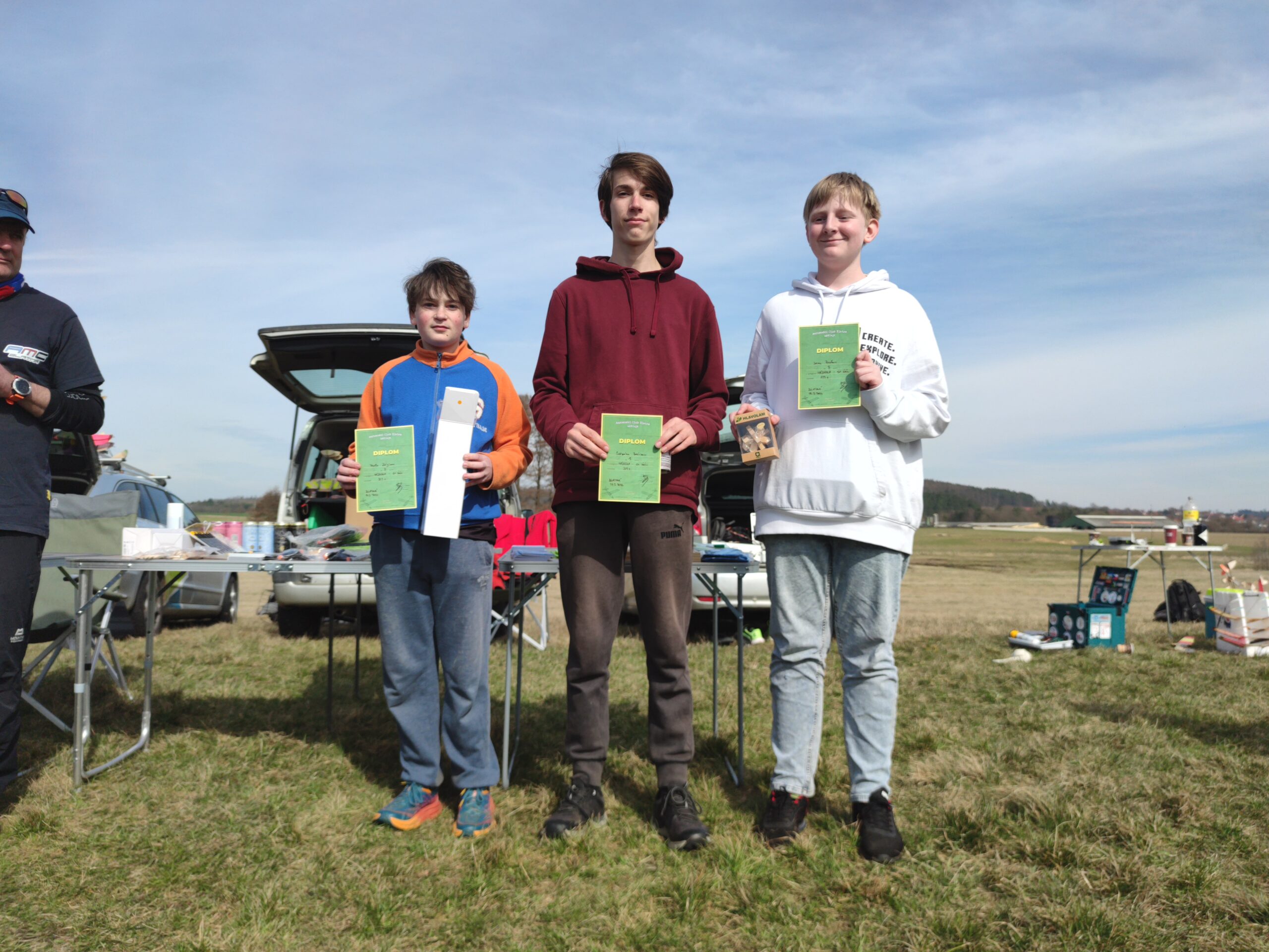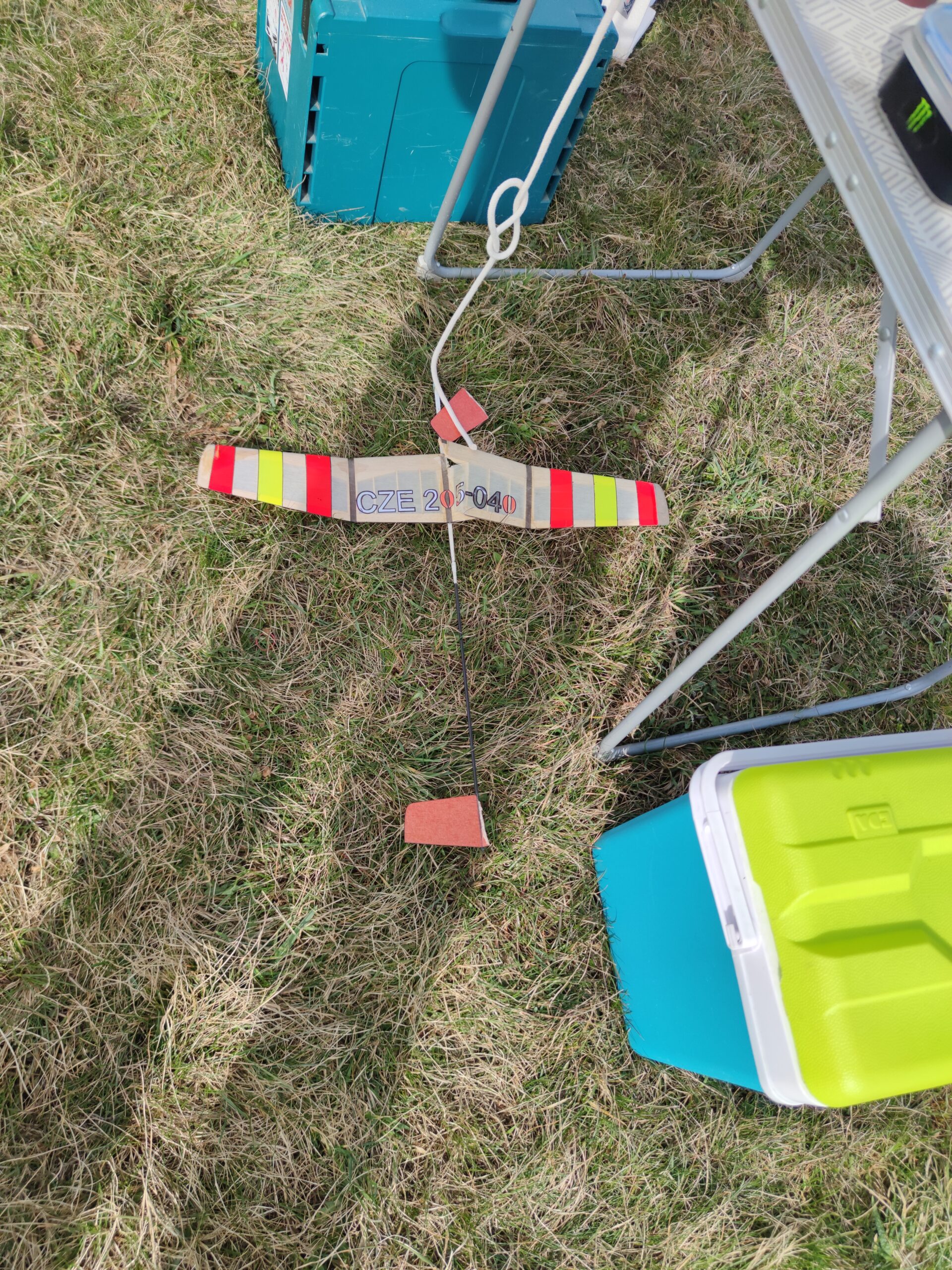 Na konci soutěže nastala pro mě katastrofa. Jeden z mladíků špatně hodil svůj model a ten se zapíchl do mého depa s házedly. Byly z to jedny prasklá křídla, dva přeseknuté uhlíkové strupy a díra v plachtě, kterou používám jako podložku. Odnesl to jeden seřízený soutěžní stroj a dva nové, které jsem ladil. Bohužel nezbývá, než vše opravit a začít se zalétáním znova.