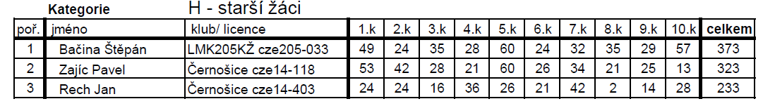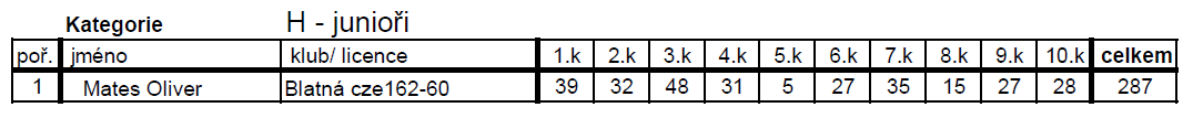 Počasí bylo dobré. Celkem teplo, až 14 stupňů, vál mírný vítr. Ale bubliny se dělaly jen pro někoho. Po deváté hodině se začalo počasí měnit. Hustý ranní vzduch byl ten tam a nezbylo než taktizovat. To plně ovládá jen Pavel Motalík a Jirka Šífi. Já jsem sice prvním hodem udělal maxe, ale pak jsem dvakrát trefil klesák a bylo to za 35. Zlobil jsem se sám na sebe, že jsem strašné kopyto a nevím kdy to mám hodit. Jirka Šífi při druhém hodu se natáhl tříslo a už nemohl chodit. Ještě chudák rozšlápl při doskoku Marcele Andrlíkové vystřelovadlo. Kromě omluvy se revanžoval jedním strojem.