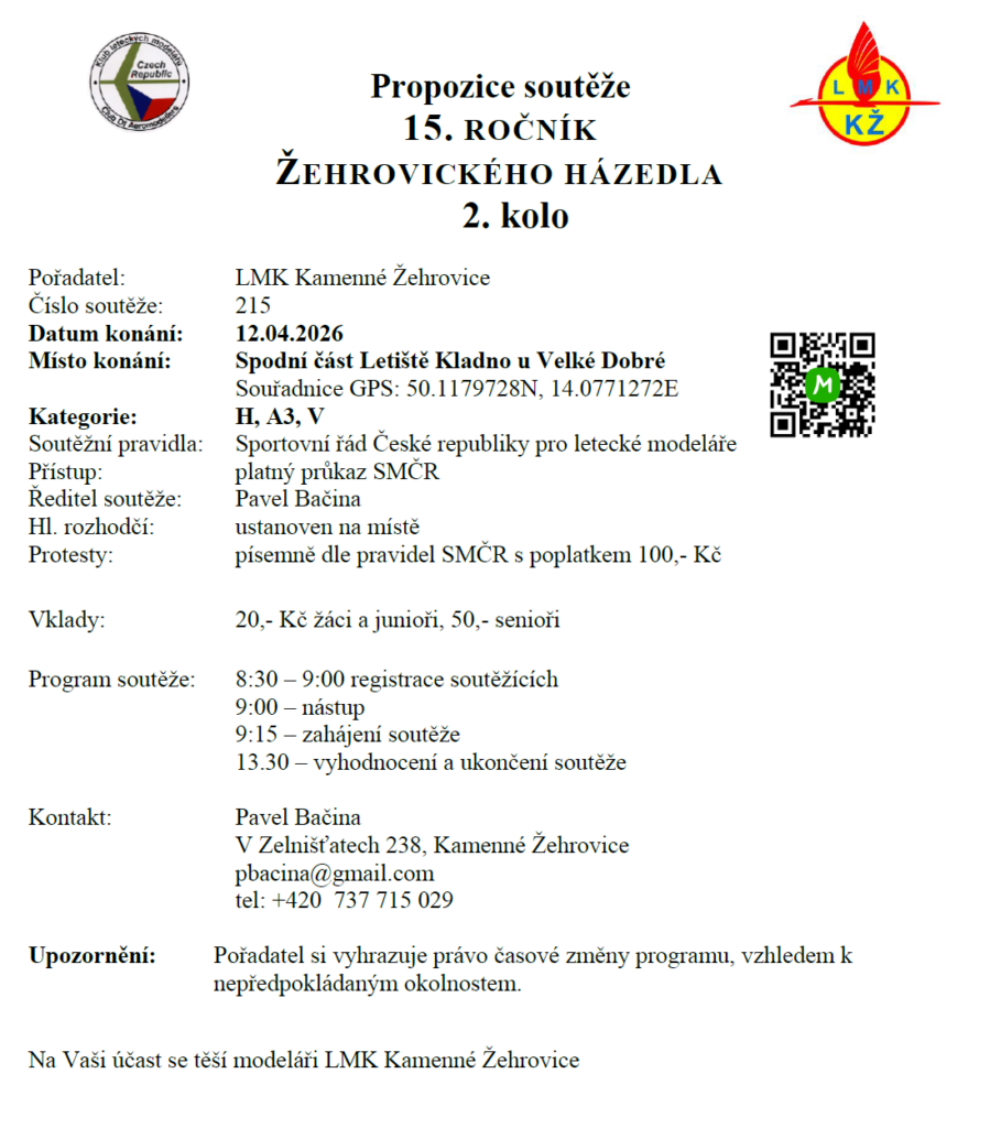 Vážení kamarádi a kolegové, máme tady již druhé kolo naší soutěže Žehrovické házedlo. Soutěž se koná v neděli 12.4.2026.