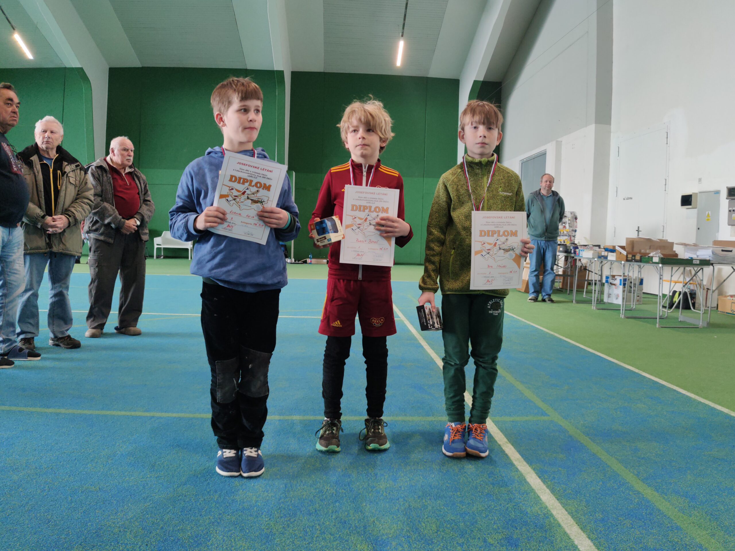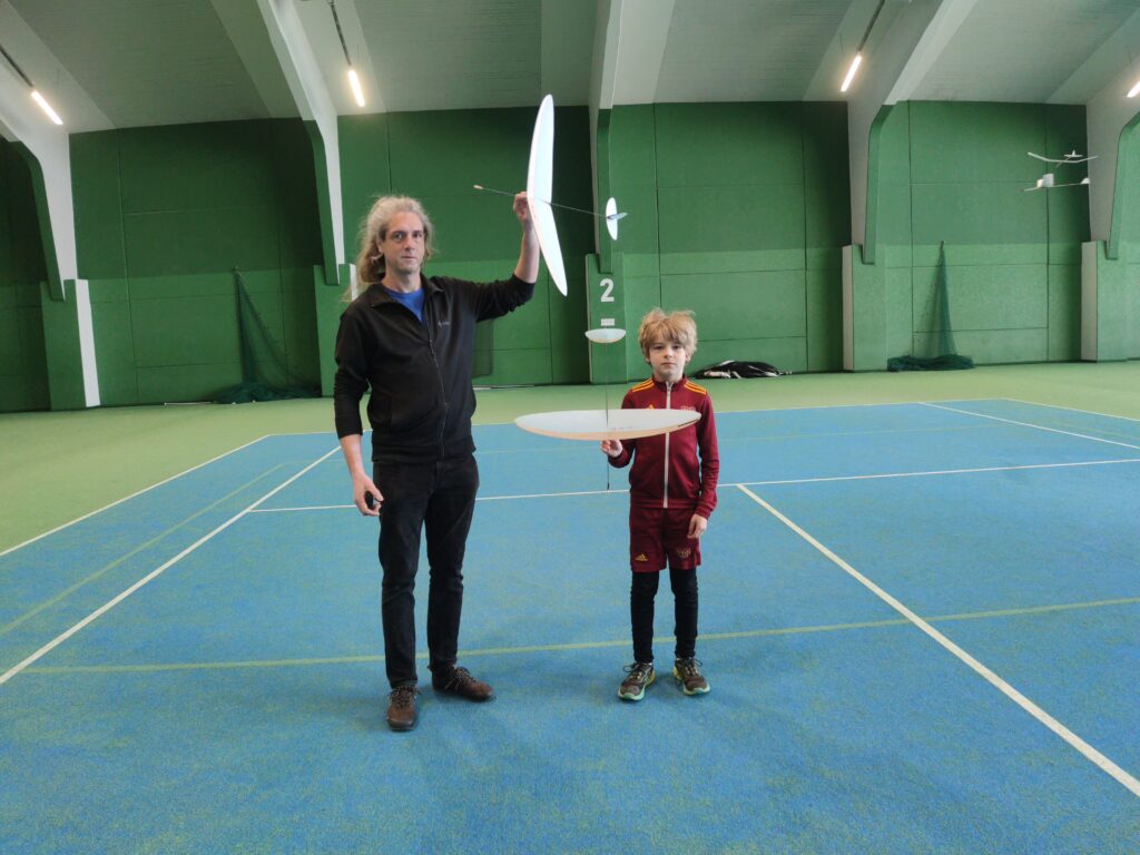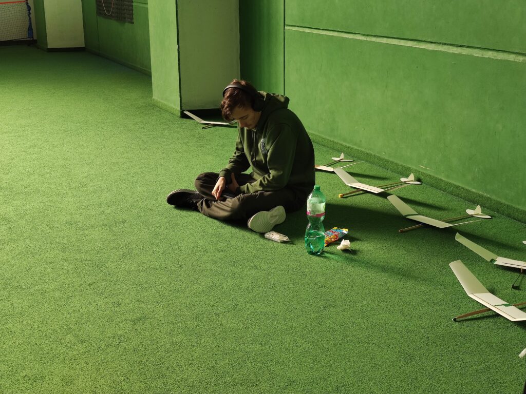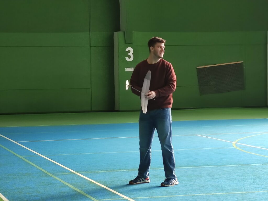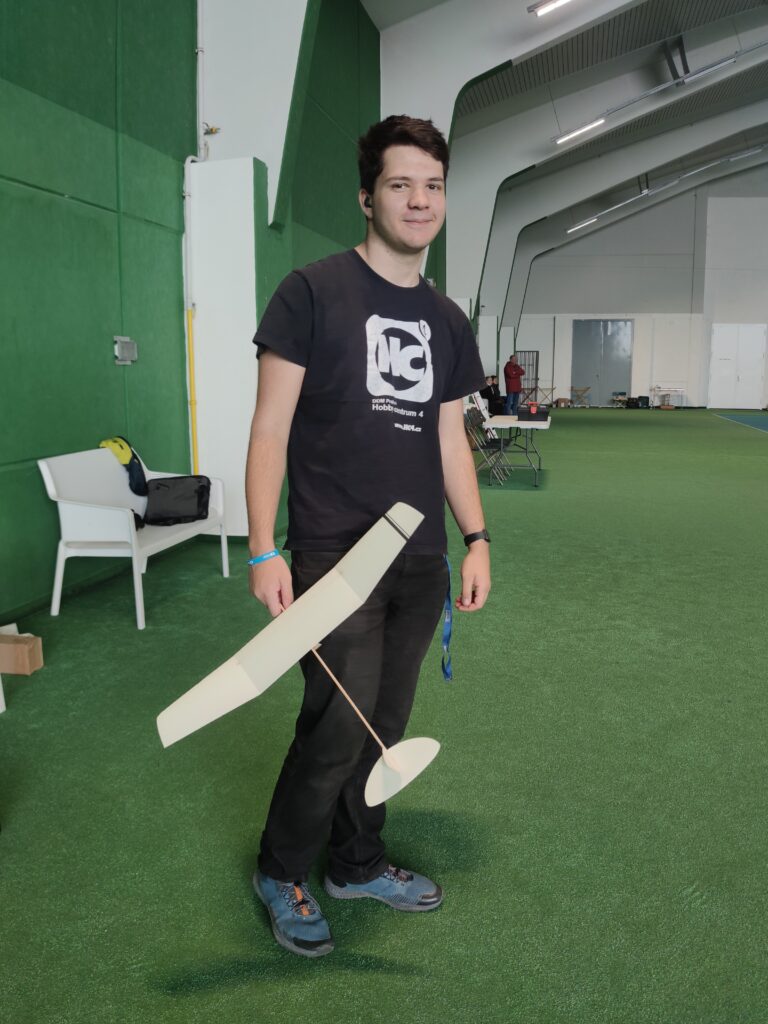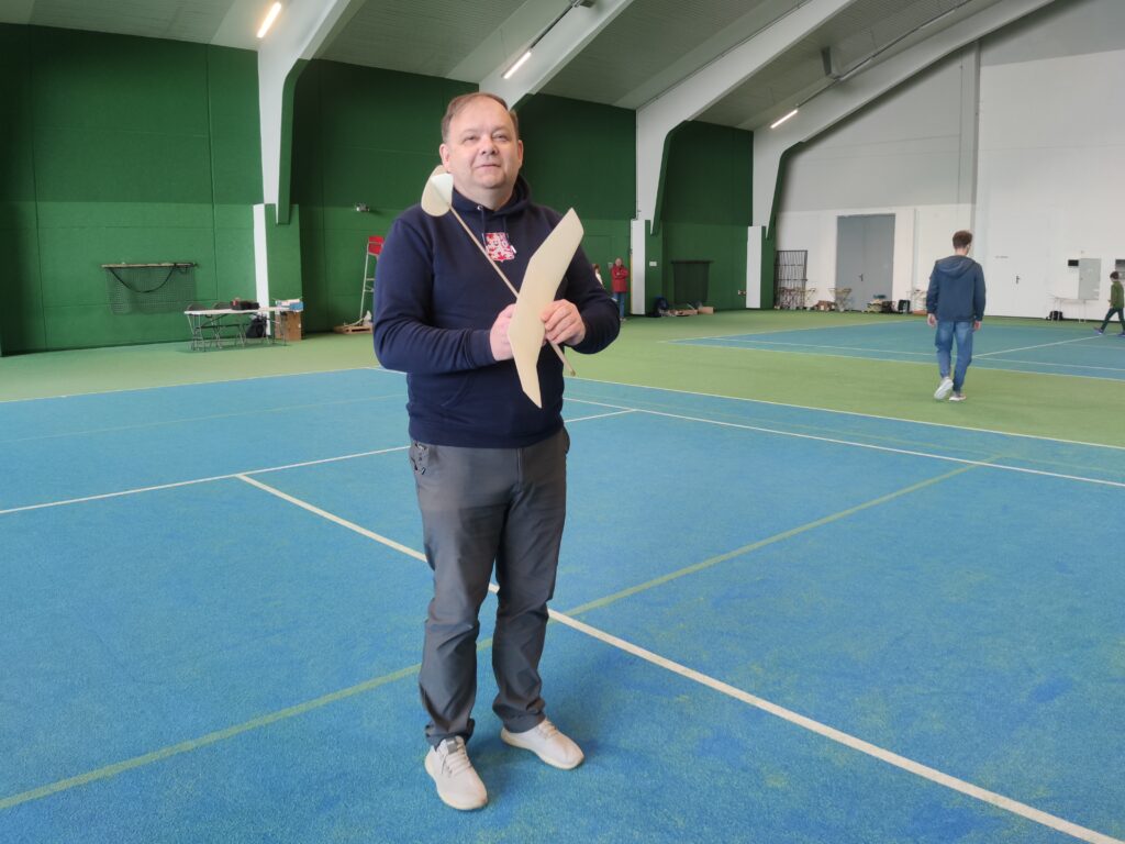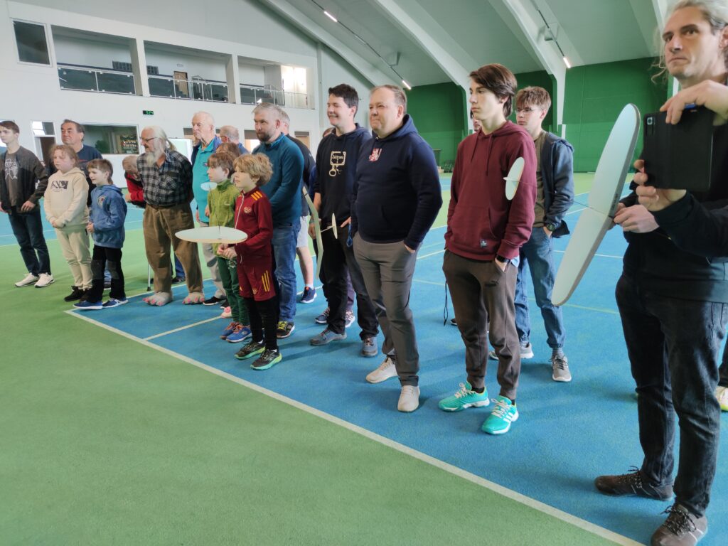 Náš cíl je jako vždy, byl překonat stovku. Po prvním kole jsem měl již 107, což bylo nadějné. Ale bylo jasné, že i ostatní se postupně zlepší. Jirkovi Juniorovi to vůbec nesedlo. Kazil, nebo házel nízko. To mě mrzelo a o přestávce jsme experimentovali s různými modely. Nic nebylo dobře, výška byla stále malá. To bylo až do konce závodu. Pavel Bačina měl slušný první hod a pak už to nebylo ono. Teprve ve třetím kole se podařilo nalétal další slušné časy. Takže přes tu stovku se v pohodě dostal. Štěpánovy lety byly docela dobré. Bohužel o tréninku došlo k rozšlápnutí jeho modelu, který vyladil a musel začít znova. Obdivoval jsem Štěpána, jak to vydýchal. Odfrkl a vzal jiný model. Maruška bere halové závody jako příjemnou změnu. Létá v klidu a relaxuje. To je dobrá cesta. Musíme jí přesvědčit na vystřelovadla.