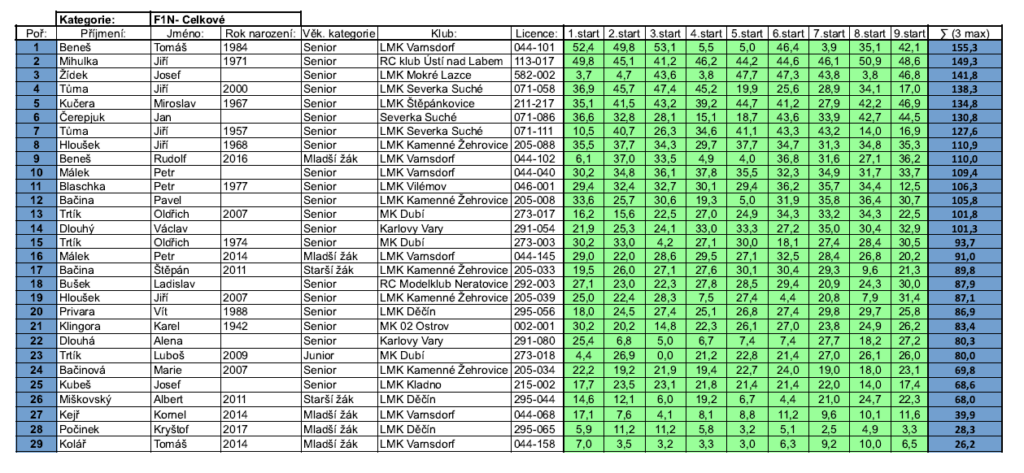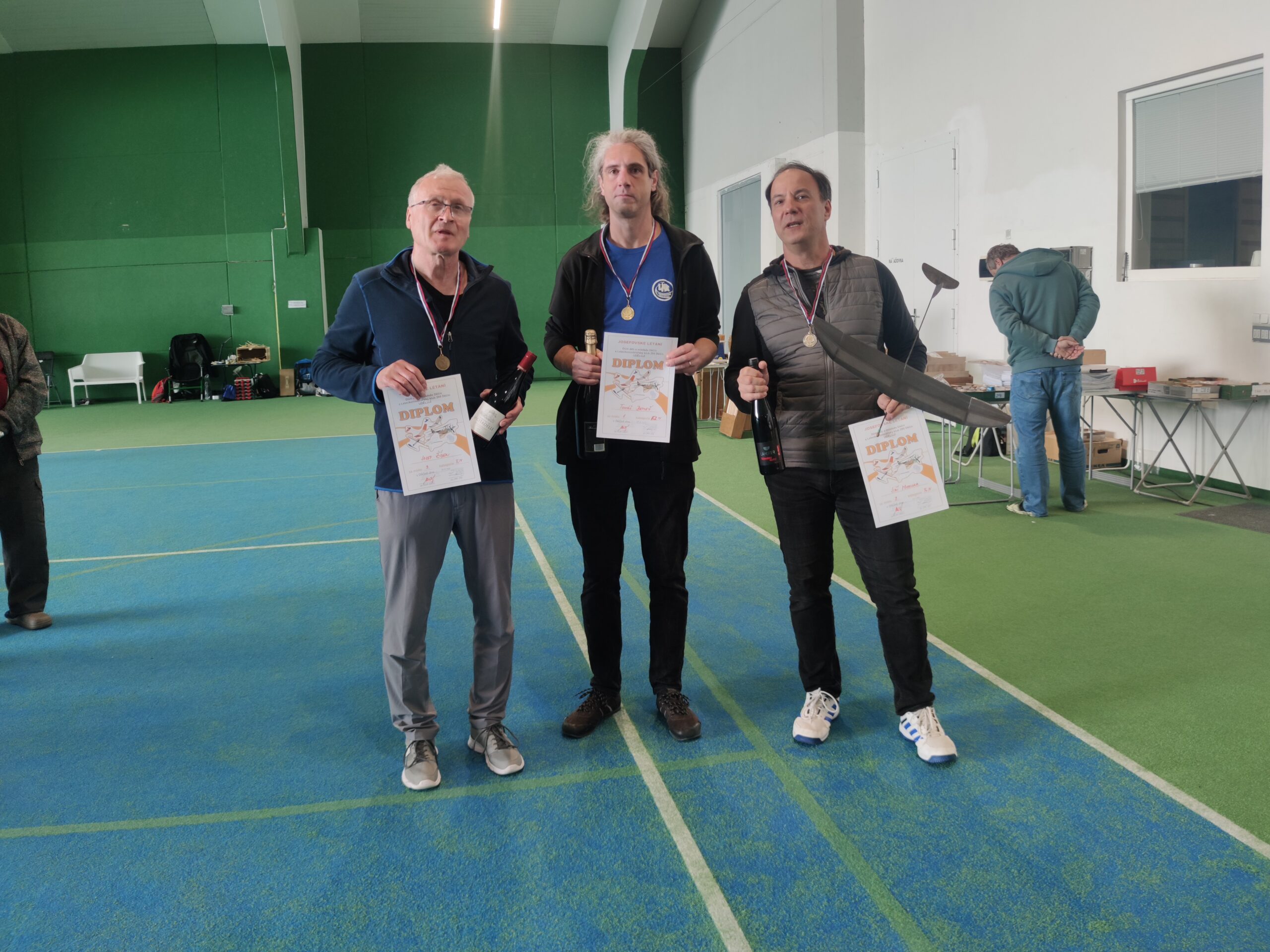 Závod pěkně běžel a já pozoroval, komu se daří a komu ne. Petr Blaschka má sice rameno po operaci, stejně jako Pepa Kubeš, ale tentokrát si házedla odlétal s pěkným výkonem. Pepa létal v podstatě symbolicky a samozřejmě, obsluhoval zákazníky ve svém pojízdném stánku. Jirka Tůma mladší házel až ke stropu. Jirkovi Tůmovi staršímu tento závod příliš nevyšel. Stěžoval si, že není schopen model optimálně vyhodit. Pepa Žídek začal pomalu a postupně. Jenže se stále více zlepšoval a jeho časy se prodlužovaly.