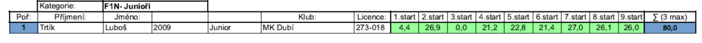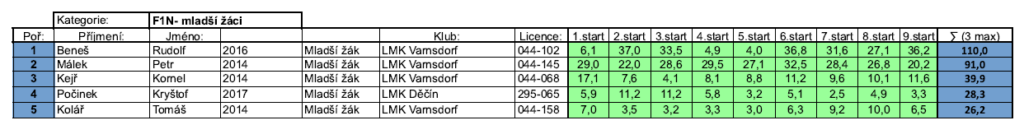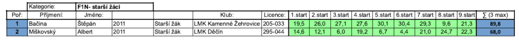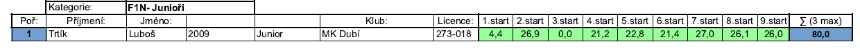 Jirka Mihulka tentokrát neměl kšandy, ale měl velmi vyrovnané časy. Nejlepší časy měl tentokrát Tomáš Beneš, který se za poslední dva roky značně zlepšil. Výsledkem byly dva časy přes padesát vteřin v prvním kole. To mu zabezpečilo první místo.
