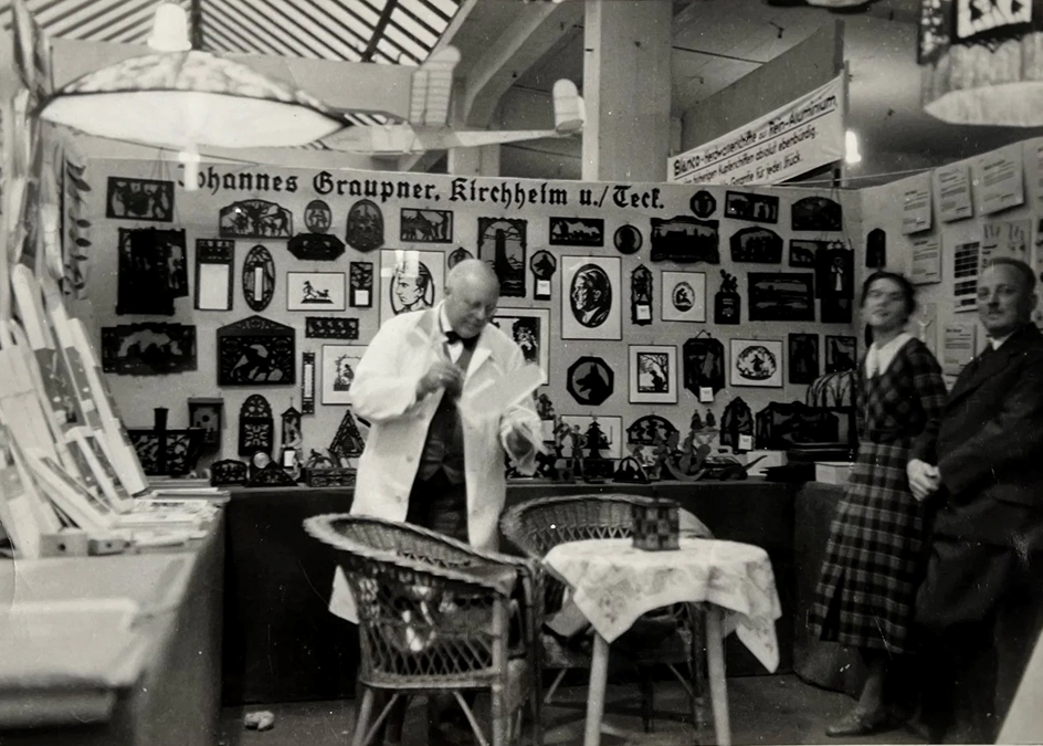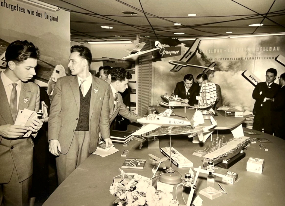 Ale odbočme. Tady je obrázek stánku firmy Graupner z veletrhu v Kolíně v roce 1936. Ještě zde převládají výrobky ze dřeva, spíše taková zateplovadla, ale již zde vidíte vystavený i model z Graupnerovy stavebnice.