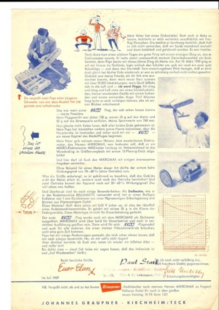 K modelu a jeho motoru se váže následující příběh: V únoru 1959 vešel do kanceláře německého časopisu „Modellflug“ Dr. Ing. Fritz Faulhaber a zeptal se, zda by motor, který vyvinul pro použití v dálkově ovládaných clonách fotoaparátu, mohl být užitečný i pro letecké modely. Motor byl Micromax, s integrovanou převodovkou.