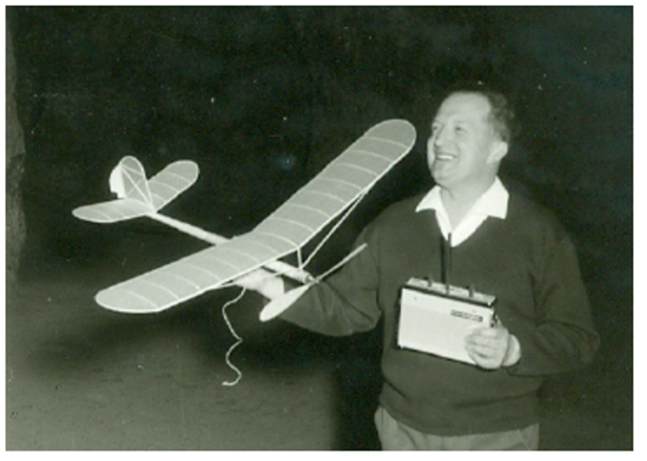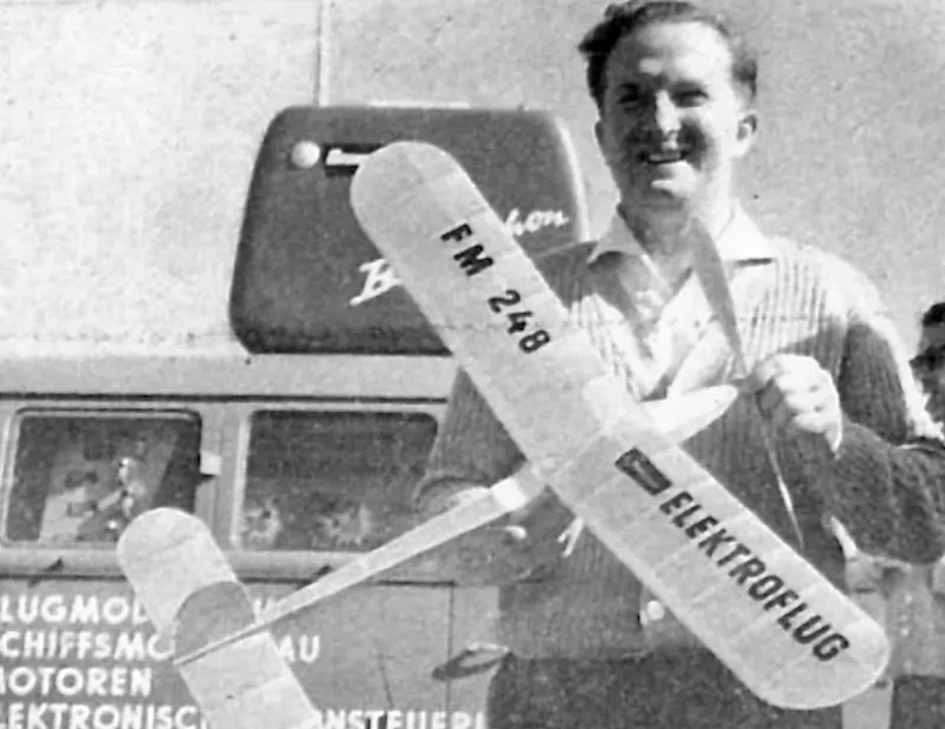 Zde je Fred v roce 1959 před reklamním autem firmy Graupner. Všimněte si, že na střeše auta je „socha“ RC vysílače Bellaphon.